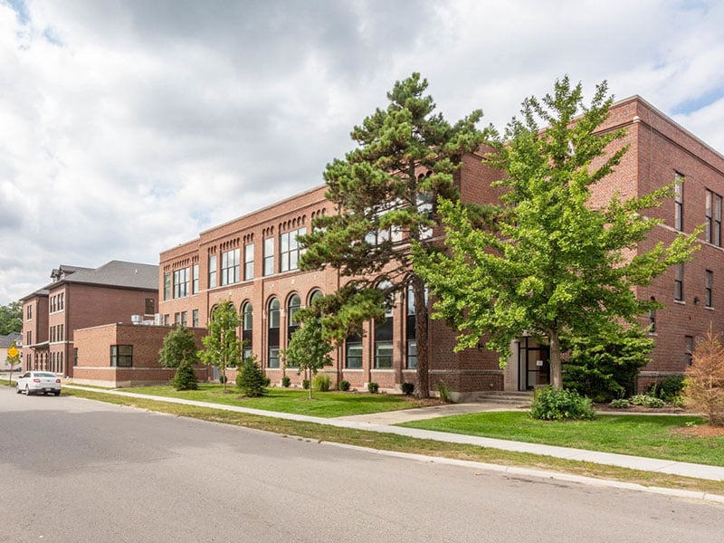 Once the historic St. James School, this Ferndale landmark was thoughtfully renovated in 2019 into a boutique 55+ community of studios, one-bedroom, and two-bedroom residences. Modern interiors complement the historic architecture — with arched doorways, original brickwork, and elegant stone details paying tribute to the building’s heritage.