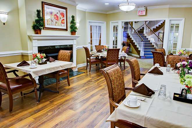 • Small dining rooms with consistent seating, which encourages familiarity and socialization. Music, centerpieces, warm scented wash towels and fresh linens enhance the dining experience.