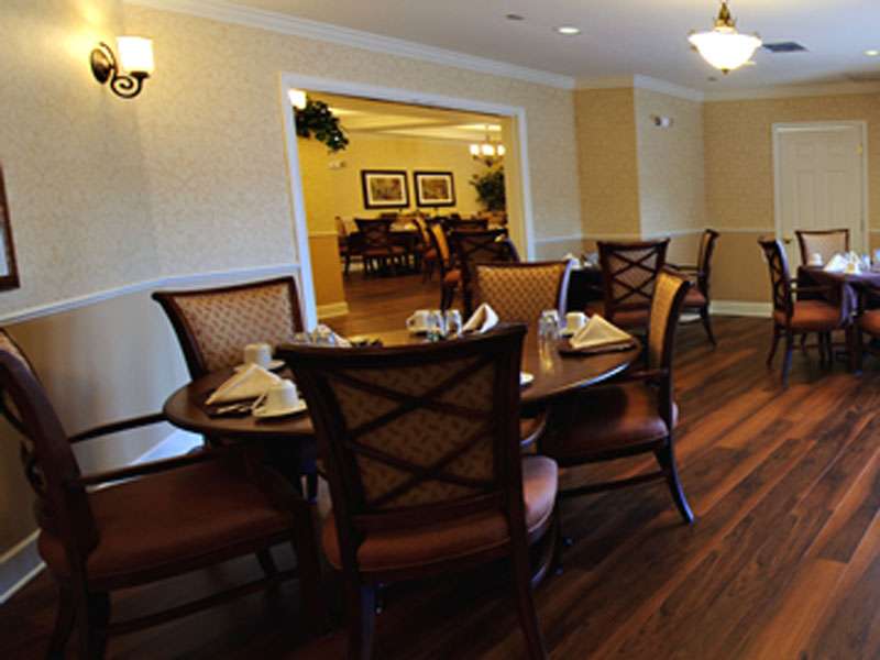 - Small dining rooms with consistent seating, which encourages familiarity and socialization. Music, centerpieces, warm scented wash towels and fresh linens enhance the dining experience.