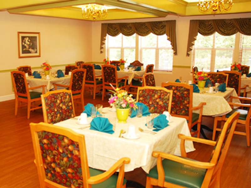- Small dining rooms with consistent seating, which encourages familiarity and socialization. Music, centerpieces, warm scented wash towels and fresh linens enhance the dining experience.